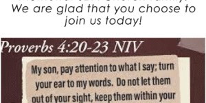 Welcome John ValentinWorship in Singing Glau BarrenOpening Song #318, "Whiter Than Snow"Children’s Story Heidi RuizWorship in Giving John NjineGarden of…